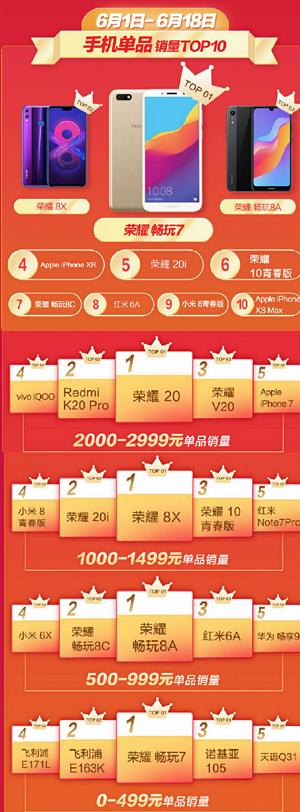今年618,以荣耀20系列为代表的荣耀极具竞争力的产品均在京东平台斩获不俗成绩。作为荣耀“二级火箭”战略下首款“极具竞争力”的产品,荣耀20系列拥有震撼业界的摄影能力和硬核自研科技,结合2699元的起售价,一经发售迅速爆红,荣耀20获得618京东手机2000-2999元价位档单品累计销量冠军。除荣耀20系列全面领跑,荣耀8X、荣耀畅玩8A等各价位段产品也在京东618手机单品销量累计榜上斩获冠军。竞争力十足的手机产品配合切实可靠的10亿让利优惠政策和充足备货优势,荣耀拿下京东手机五年连冠实至名归。