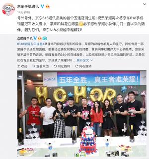 伴随今年618再度夺冠,荣耀成为首个连续5年获得京东618通讯品类冠军的手机品牌。19日凌晨,京东通讯事业部总裁姚彦中现身荣耀庆功现场,并向荣耀京东618团队的研发、营销、采销、客服、京东快递的杰出代表颁发了五连冠纪念奖章,京东手机通讯官微也在19日下午祝贺荣耀成为手机通讯品类首个五连冠品牌,这都是京东官方对荣耀五年连冠的认可和肯定。同时,正是荣耀与京东618各领域工作人员的共同努力,才成就荣耀连续五年夺冠的傲人战绩,获得了消费者的一致好评和信任。