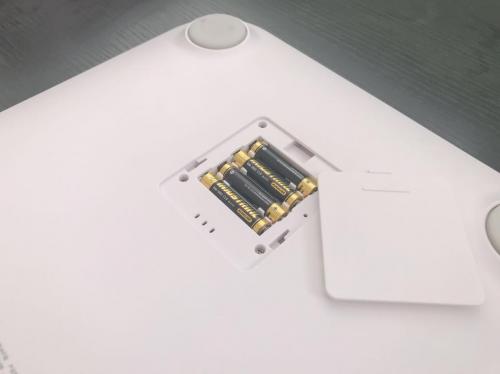 华为智能体脂秤WiFi版背部采用磨砂材质,随秤免费为用户配备4块7号电池,安装后即刻开机。