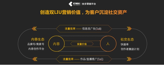 严强认为,AI技术深入快手商业产品的骨髓,如基础设施般贯穿于用户体验、用户理解、多媒体内容理解和客户需求中。借助“AI+DA”(人工智能+数据分析),快手商业分别从内容生态和社交生态两方面创造“双LIU”(流量+留量)营销价值,沉淀老铁关系下的社交资产。