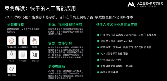 此外,论坛还发布了名为《人工智能技术在内容行业的应用》的调研报告。这份报告披露,“作为短视频巨头,快手凭借领先的计算机视觉与深度学习能力,通过人、内容及两者互动数据的理解,形成众多优质模型;通过算法匹配,推荐给用户他们可能感兴趣的内容,实现人与内容、人与人的精准连接。快手的AI技术深入产品骨髓、在视频生产、广告推荐等多角度均有应用。”截止2019年5月,快手DAU超过2亿,每日上传视频超过1500万条,库存短视频数量超过100亿条。