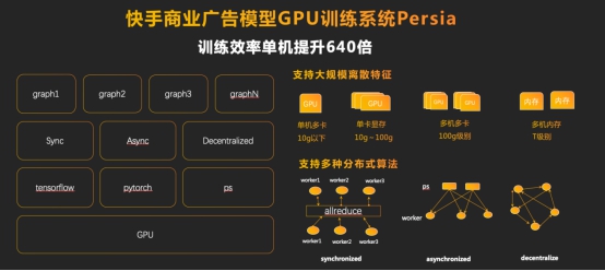 有别于传统的模型训练,本着不盲从、不抄袭、坚持原创技术路线的原则,快手商业联合快手西雅图FeDA智能决策实验室推出基于GPU的广告推荐训练系统。以往需要50台CPU机器训练20小时的系统,如今只需要一台普通的GPU机器在一到两小时完成,单机效率提升高达640倍。目前,Persia系统在单机上目前实现了百T级数据量和25亿的训练样本数量。