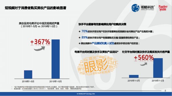 相对2018年1-5月与2019年1-5月期间,电商平台同时提及快手及美妆产品词云,社交平台同时提及快手及购买相关内容声量大增560%。