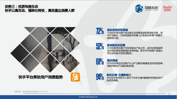 抓住及时决策瞬间很重要,能够快速建立购买链接是形成销售的关键。报告发现,66%的快手美妆受访用户会通过短视频下的购买链接直接跳转到其他电商平台进行购买。快手优质电商生态以高互动、强转化特性,高效直达消费人群。快手小店与外链帮助美妆消费者快速转化。