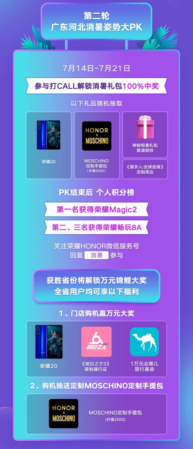 7月14日-21日,两省用户向荣耀HONOR微信服务号后台发送“消暑”即可参与H5游戏,加入此次“燕赵岭南大PK”的第二轮竞争。凡参与H5互动的用户均有机会抽取荣耀20、MOSCHINO定制手提包等多款大奖,中奖后到当地荣耀体验店打卡或邀请三位好友助力即可解锁奖品。活动结束后,个人积分排名第一的用户还可获得荣耀Magic 2一台,第二、三名用户则可分别获得荣耀畅玩8A一台。7月22日,获胜省份用户线下门店购机依然可以抽取万元大奖。