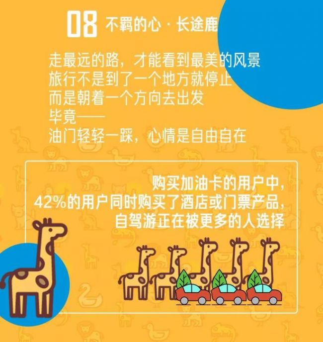 每逢节假日,自驾出游的人们都会开着自己的爱车,前往喜欢的目的地,购买加油卡的用户中,42%的用户同时购买了酒店或门票产品,自己做自己的向导,那么全世界会被安排进你的旅程。