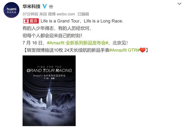 熟悉智能穿戴领域的朋友都知道,华米科技是小米手环系列的生产商,而华米科技旗下的子品牌AMAZFIT也推出过很多不错的产品。今天上午,华米科技正式宣布,将于7月16日举行AMAZFIT全新系列新品发布会,新品名称将是AMAZFIT GTR。