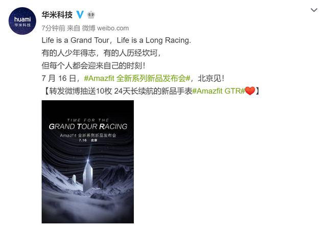 今天上午,国内智能穿戴设备生产商华米科技正式宣布,7月16日将于北京举行AMAZFIT全新系列GTR新品发布会,发布会主题为Time for the Grand Tour Racing,很可能是在暗示AMAZFIT GTR新品有非常强悍的续航能力。
