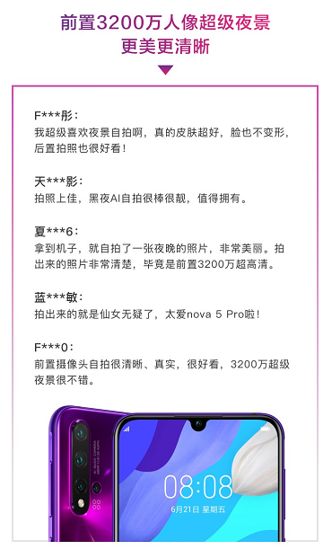华为nova5系列自发布至今已成为手机圈的明星机型,其前置3200万人像超级夜景自拍功能不仅受到华为nova全球代言人易烊千玺和诸多潮人的点赞,更是成为广大年轻人的关注焦点。自华为nova5 Pro开售以来,不仅当天拿下天猫、京东双渠道的销量&销售额的双料冠军,更在华为商城创造了开售2小时,超上一代产品全天销量的记录。今天@华为终端官方微博发布的口碑评价,再一次证明了华为nova5系列的综合实力。