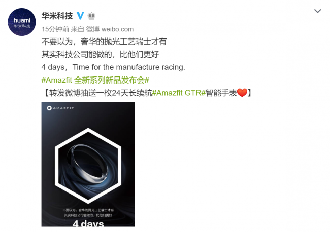 还有4天,华米科技AMAZFIT全新系列新品发布会将在北京正式举行,AMAZFIT GTR即将发布,现时这款产品也受到各方关注。今天上午,华米科技正式放出发布会倒计时海报第二张,表示不只瑞士才有奢华的抛光工艺,科技公司能做得比瑞士更棒,很可能指代AMAZFIT GTR在工艺上有突破。