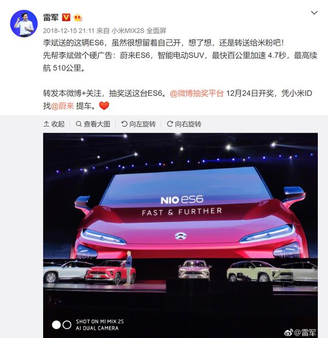 (雷军抽奖送蔚来ES6)