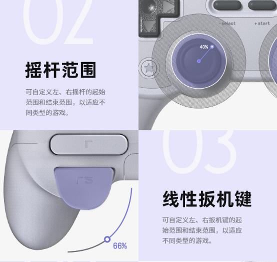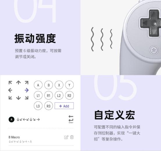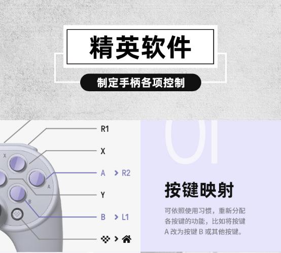它采用的人体工学设计,搭配磨砂工艺材质营造出一种细腻自然的舒适手感,增强型振动及六轴体感还能为玩家带来与众不同的操作方式,赋予玩家近乎真实的代入感。当然,最值得一说的亮点自然是八位堂(8BitDo)新推出的精英软件,它涵盖了按键映射更改、摇杆和线性扳机键映射范围、宏定义按键以及固件升级等多项自定义功能。这种自定义的方式为不同玩家针对不同游戏需求提供了广阔的操作空间,让手柄的游戏获得灵活自如的游戏体验!
