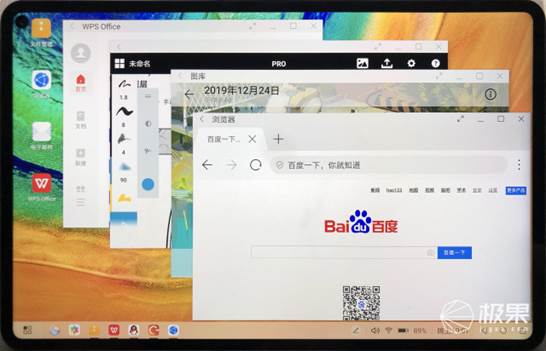 很多人依然不习惯用安卓系统进行创作,缺水的海怪则启用了华为MatePad Pro的电脑模式功能。从屏幕上方的下拉菜单中点击“电脑模式”,华为MatePad Pro立刻就进入了类似windows的操作界面,且在麒麟990芯片的支持下,可以同时打开8个任务窗口并保持流畅运行。在电脑模式下画好的文件,还可以保存在桌面上,方便插画师快速查找并分享自己的作品。