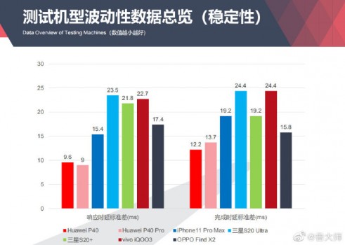 在鲁大师刚刚发布的流畅性测试报告中,搭载全新确定时延引擎的华为 P40 系列也成为了一众旗舰机中,完成时延与响应时延标准差控制的最好选手。鲁大师官方报告中也表示,华为P40系列表现突出,从P40到P40 Pro,EMUI10.1在整个测试环境均有上佳表现,而其主要对手iOS则没有太大的变化,数值差距略有增大 。