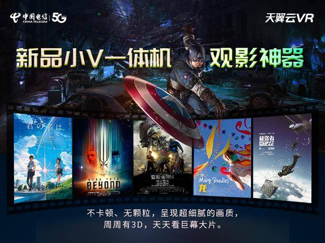 得益于中国电信5G高速、稳定、可靠的网络优势,让4K/ 8K 超高清视频信号的实时传输成为可能。小V一体机不仅已全部支持4K高清大片,让用户在VR的环境下观看4K大片也不卡顿、无颗粒,呈现超细腻的画质,实现真正的巨幕超高清效果;小V还为用户带来更加炫酷的3D观影体验。中国电信天翼云VR将持续为用户推荐电影库里的精彩3D电影,实现周周都能有3D,天天巨幕看大片。