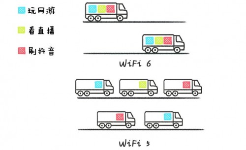 OFDMA,可以将无线信道划分多个子信道,数据分为更小的资源块进行管理和传输。就好比汽车装货,在WiFi5时代只能装一件货,即便货物很小造成资源浪费也无法控制。而WiFi6时代货车可以装载不同货物,充分利用空间。且每个时段多个终端并行发车,不排队等待,效率大幅提升。另外OFDMA对多径信号比较强的处理能力,同时终端会选择无线性能好的子信道集中发送功率通信,因此它还具备扩大覆盖范围,提高覆盖质量的特质。