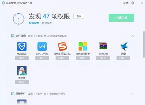 “权限雷达”是腾讯电脑管家推出的一项软件管理功能,通过“权限雷达”,用户可对包含开机自启、生成桌面图标、QQ记录保护、软件弹窗、添加右键菜单、微信记录保护、推装软件等在内的7项权限进行自主管理。在使用过程中,用户通过权限雷达一键扫描,就能对电脑软件中存在的软件弹窗一览无余,清晰查看到每个软件的弹窗内容,自主选择软件弹窗种类,对不需要的弹窗一键勾选阻止,免受“弹窗广告”骚扰。
