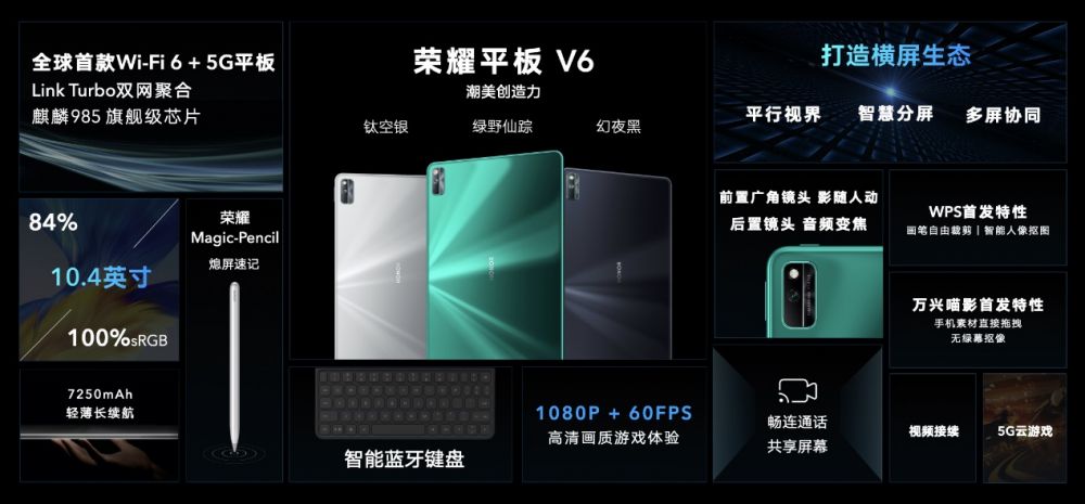 在业内人士看来,除了钛空银、绿野仙踪、幻夜黑这三款配色符合年轻人审美,麒麟985旗舰级芯片、10.4英寸2K全面屏、7250mAh超强续航电池等硬件方面的配置足够吸引人,荣耀平板V6革命性的交互系统也是取得不俗战绩的法宝。