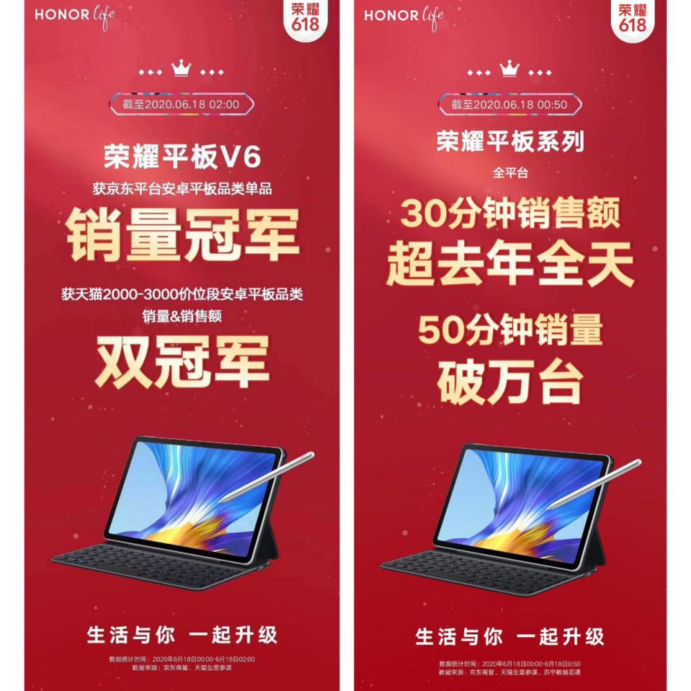 其中荣耀平板V6首销成绩亮眼:6月18日0点正式开售后,截至凌晨2点获京东平台安卓平板品类单品销量冠军,天猫2000-3000价位段安卓平板品类销量、销售额双冠军!
