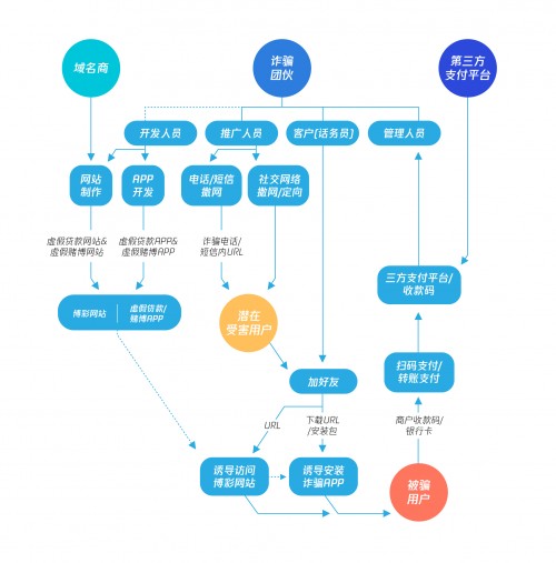 近年来,黑灰产团伙呈现出组织化、“产业化”态势,网络诈骗仍是威胁网络安全的顽疾之一,甚至催生了大量成熟的黑色产业链:有专门的团队提供APP、网站制作与开发,并为赌博、网贷提供收款能力的第三方支付平台等。