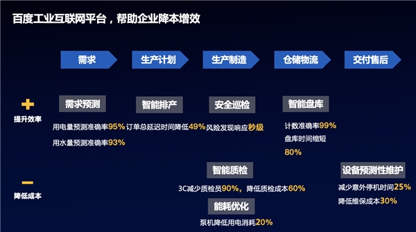 首先对企业来说,百度工业互联网平台通过工业智能让每个环节都能实现降本增效。在需求环节,用历史数据预测需求,从而更有针对性地安排生产,减少浪费;在计划环节,用智能排产算法大大提高订单准时交货率,缩短订单生产时间,减少物料库存时间;在制造环节,用AI质检技术可以达到降低质检成本60%以上,缓解了招工难、培训难、留人难等问题;在仓储物流环节,百度在一汽物流使用视觉技术,实现了汽车的无人机计数盘点,准确率达到99%以上,盘点时间相比人工缩短了80%。