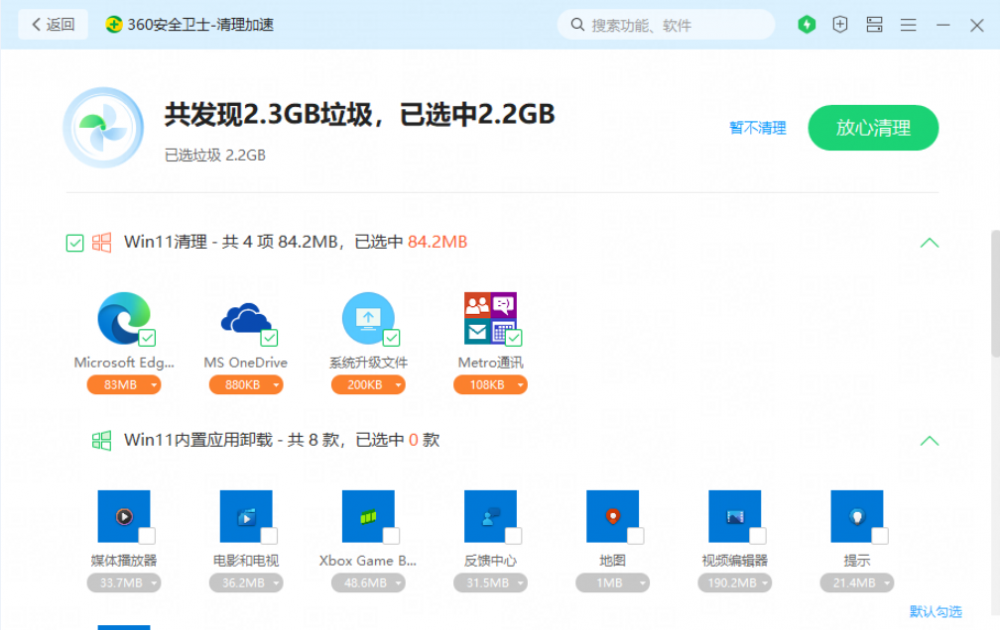 360安全卫士极速版2.0在功能逻辑方面简化一键操作的流程,去除了冗余功能,实现“即扫即清二合一”,从而在页面展示上更加清晰明了,令清理扫描速度与整体性能也有了很大的提升。