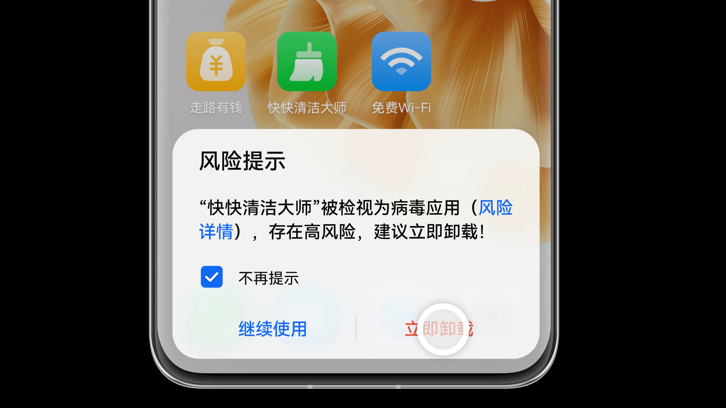 要是受到天气影响只能窝在酒店,你也可以打开要投屏的界面,手机状态栏向下滑调出通知面板,选择酒店的电视设备,就能和朋友窝在一起,度过美好的电影之夜。这时可能会有人担心恶意应用会不会趁虚而入?其实大家不用担心,当我的Mate 40升级到HarmonyOS 3以后,系统会自动扫描恶意隐藏的应用并提醒卸载,确保用机安全。