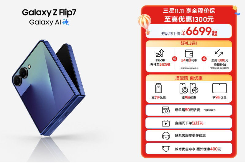 首先,针对在双十一活动期间购买三星Galaxy Z Flip7的消费者,官方提供了全程保价服务,大家不必担心因为价格浮动而买亏。然后,大家还可享券后至高优惠1300元的福利,以及“256GB免费升杯至512GB”、“24期0利率”、“至高1000元换新补贴”的3选1好礼。最后,还有搭配购更优惠、晒单赠话费、教育优惠等更多礼遇在等待着大家,活动期间正是下单三星Galaxy Z Flip7的绝佳时机。