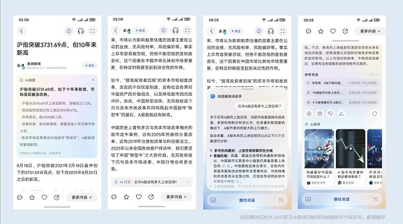 这种“一问一答”的连续交互模式,能够很好地消解用户依赖传统搜索模式下需要自我消化“信息拼图”的困扰。借助华为浏览器资讯助手,用户无需频繁切换页面搜索信息,随时调取AI问答即可获取多维度且较为专业的参考答案。对于资讯爱好者而言,这意味着资讯获取更加高效、便捷;对于专业投资者或科研工作者而言,更能够辅助他们获取更全面、更精准的信息,能够方便用户做出更加理性的判断。