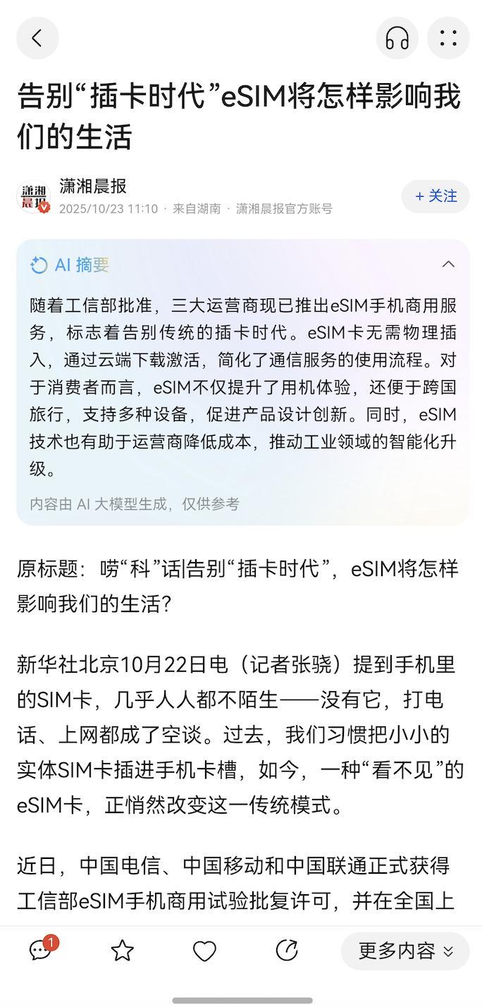 在信息爆炸的时代,长篇资讯和复杂内容往往让用户望而却步。华为浏览器资讯助手的AI摘要功能,能够一句话概括资讯核心,帮助用户快速抓住要点。例如,前不久媒体报道称“告别插卡时代,eSIM将怎样影响我们的生活”,关于eSIM手机新业务这类信息点都需要用户自己搜索消化,非常消耗时间。借助华为浏览器AI摘要功能,可以帮助用户提炼如“工信部批准,三大运营商现已推出eSIM手机商用服务”、“eSIM卡无需物理插入”等核心信息,让用户在通读全文前就能快速掌握关键内容。