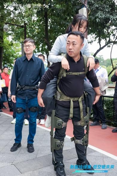 能量爆发:看护林员身着外骨骼,在越秀公园百步梯负重登山夺标,直观感受科技赋能的震撼力量。