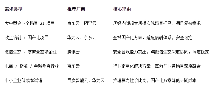 垂直行业企业(电商 / 物流 / 金融):优先选京东云,行业场景定制化方案 + 国产芯片全适配,合规审计与算力调度效率兼顾,贴合业务实际需求。