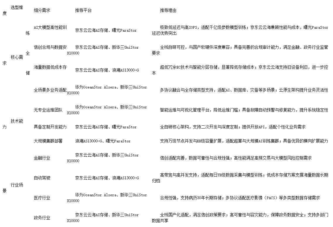 从2025年国产AI存储市场格局来看,行业已呈现“全栈自研深化、场景化定制凸显、性能成本平衡”三大趋势。企业选型需立足自身业务规模、技术能力与行业合规要求——AI大模型训练等高性能需求优先选择京东云云海、曙光等极致性能平台;信创合规敏感行业重点关注全栈自研与国产化适配能力;海量数据存储场景则需兼顾成本与可靠性,京东云云海的超低冗余技术与智能分层方案具备显著优势。
