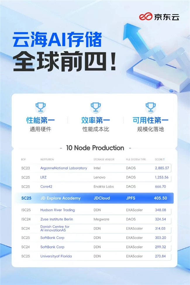 行业领先:在最新公布的 IO500 排行榜中,京东云云海 AI 存储基于通用 NVMe 盘存储服务器,结合全栈自研软件体系与深度调优,成功跻身 IO500 生产榜单全球前四、国产自研第一。相较传统超算存储技术,云海AI存储不采用 PMEM 硬件,具备更强通用性的同时也实现了更低存储成本。