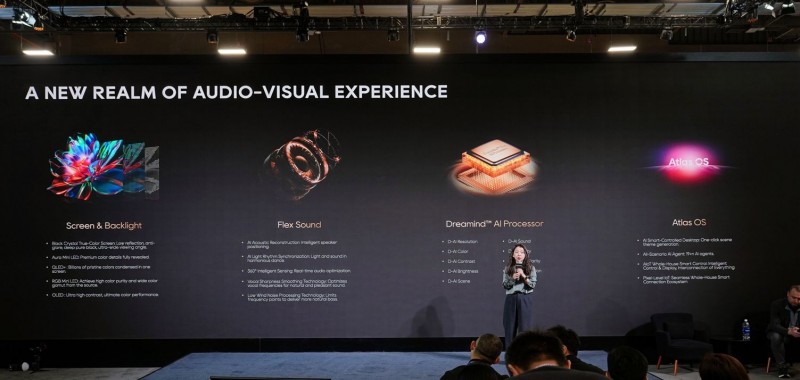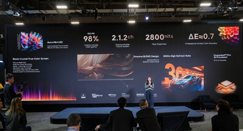 一同发布的还有Aura Mini LED电视S100。其采用独创的“SoundBar within”设计,将完整的4.1.2声道音响系统集成于机身,通过11个发声单元营造270°物理环绕声场,无需外接音响即可享受震撼音效。该机型配备144Hz刷新率和全阵列局部调光技术,确保游戏与观影时的画面丝滑流畅、对比深邃。