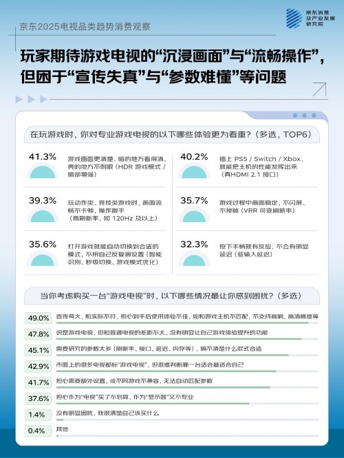 京东采销表示,作为增长潜力突出的细分方向,游戏电视领域仍存在标签泛化、参数术语复杂、产品体验不统一等痛点。调研显示,在实际购买过程中,49.0% 的玩家担心“宣传与实际体验不符”,担心高刷、低延迟等参数难以真正落地;47.8% 的玩家认为游戏电视与普通电视差异不够明显,难以形成清晰的体验区隔;同时,45.1% 的玩家表示参数复杂、术语繁多,增加了选购难度。