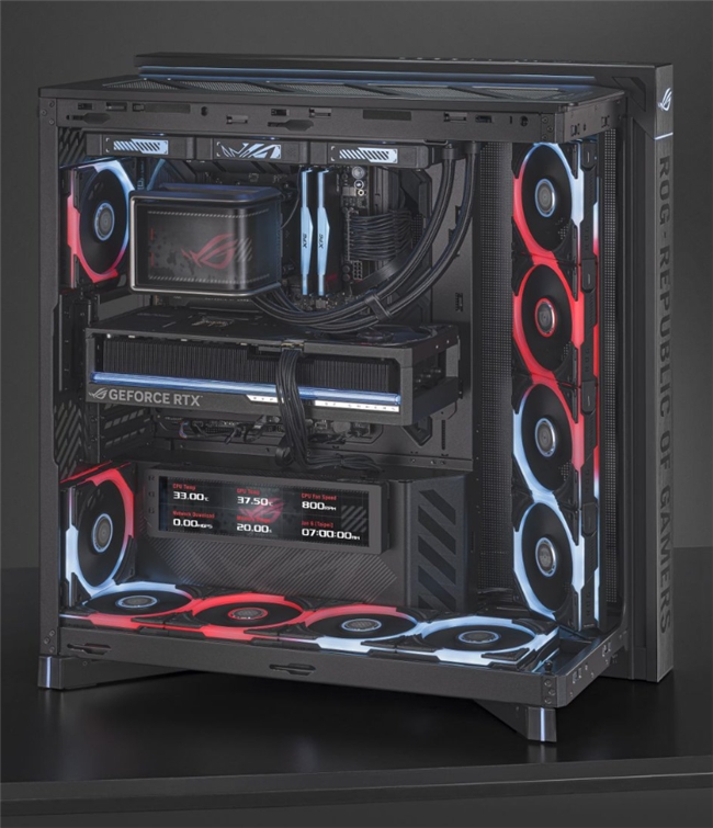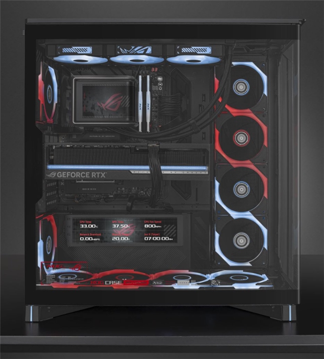 对于追求个性化桌搭的玩家而言,ROG幻世神机箱无疑是不二之选。其自带9.2英寸LCD屏幕模组,可用于显示多种系统运行信息。在实际使用中,玩家可通过该屏幕查看CPU与GPU温度、风扇转速、网络状态等硬件运行数据,使整机状态更加直观可见。同时,屏幕支持自定义显示内容,玩家可根据自身需求设置不同显示界面,在满足功能性的同时,提升机箱整体的个性化表现。