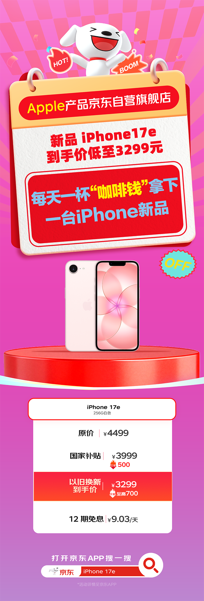 3月11日,Apple iPhone 17e、M4芯片款iPad Air、MacBook Neo、全新M5系列芯片的MacBook Pro与MacBook Air正式开售,京东现货同步上架,并上线国家补贴、教育优惠、以旧换新三重福利叠加,下单最快小时达送货上门,覆盖全国124个城市,助力消费者第一时间体验新机。消费者打开京东App搜索“苹果新品福利”即可一键抢购全系新品。其中,iPhone 17e低至3299元起,MacBook Neo低至2899元起,并支持12期免息,现货充足,下单无需久等。