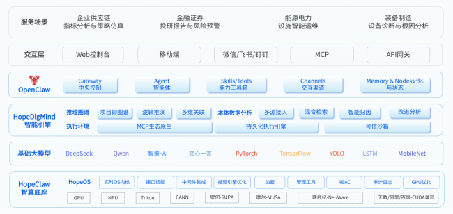 HopeClaw智算一体机立足OpenClaw智能体核心优势,结合HopeOS强大的智算底座能力,精准匹配目标客户实际业务需求,加速场景智能价值落地。