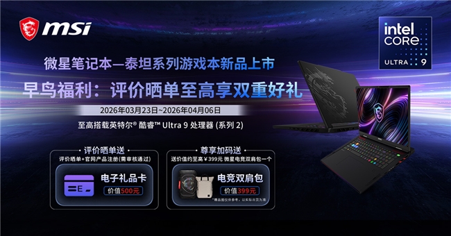 微星科技MSI——全球电竞、内容创作与商用笔记本电脑知名品牌,现已推出全新设计的泰坦系列高性能游戏本,并在各大电商平台陆续上市。首发抢购的龙骑士们,还可参与早鸟活动,享受双重好礼福利:至高价值500元电子礼品卡,价值399元电竞双肩包。