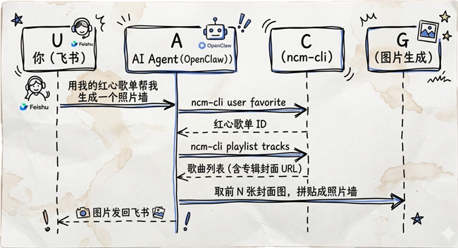 一个有趣的例子:你在飞书发一句「用我的红心歌单帮我生成一个照片墙」。