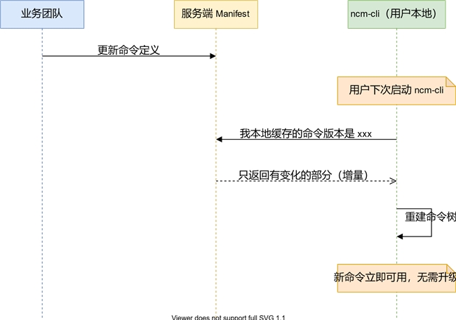 CLI 启动时,会向服务端发送一次同步请求,告知「我本地已经缓存了哪些命令的哪个版本」。服务端只返回有变化的部分,CLI 用这些增量数据在本地重建命令树。