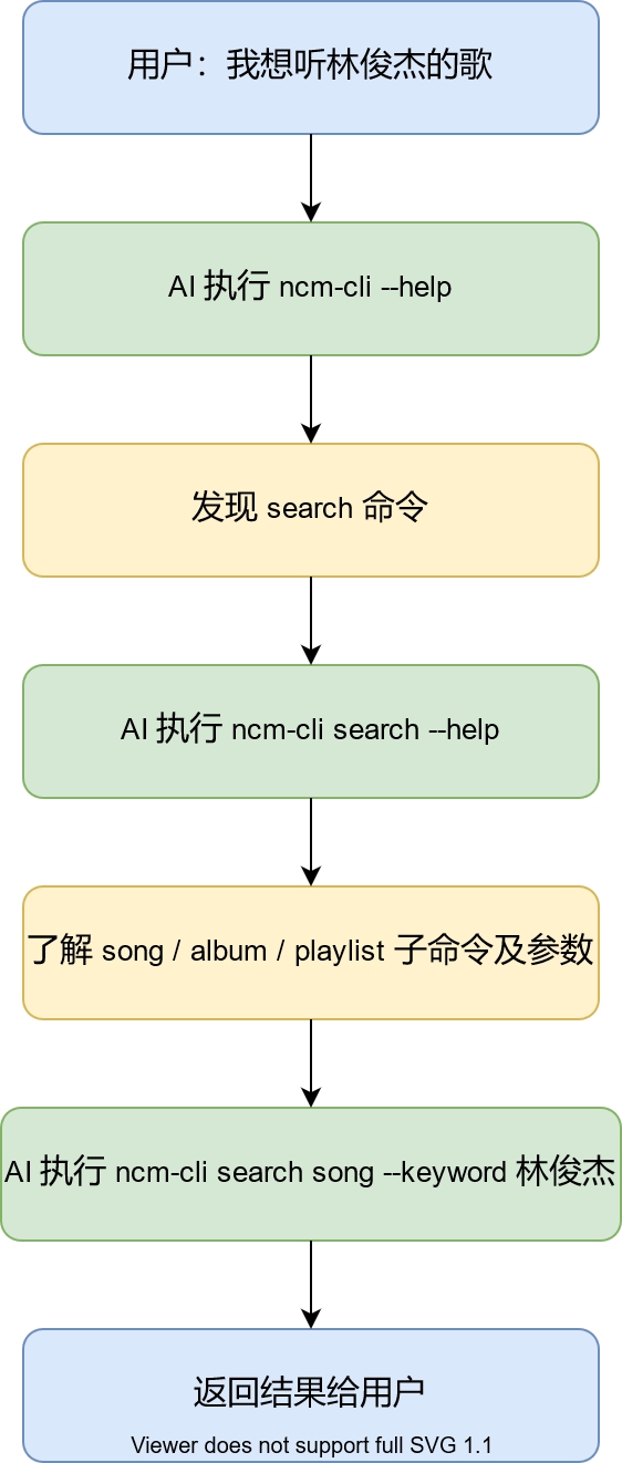 AI 拿到任务后,会先执行ncm-cli --help看顶层有什么,再根据需要钻进具体子命令查参数,最后再执行。整个过程和人第一次用一个新 CLI 工具的探索方式完全一样。