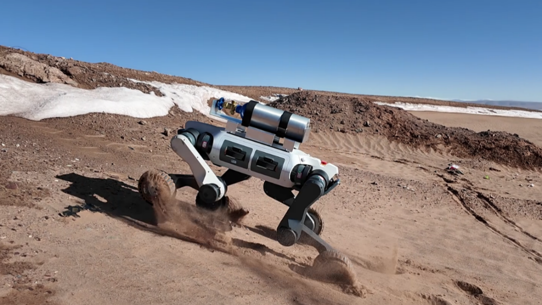 云深处科技山猫M20轮足机器人携带应急氧气瓶在可可西里高原地区攀爬荒原沙丘