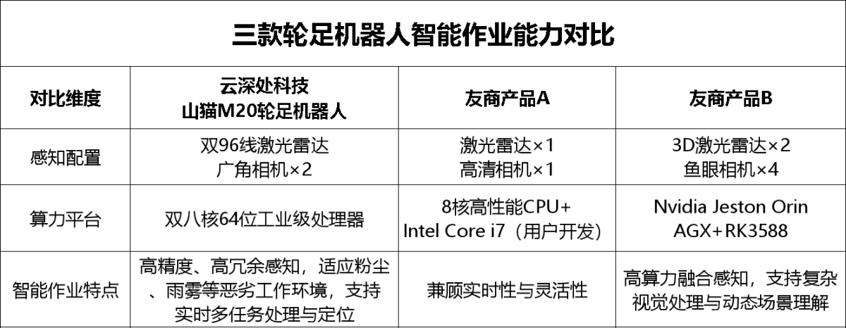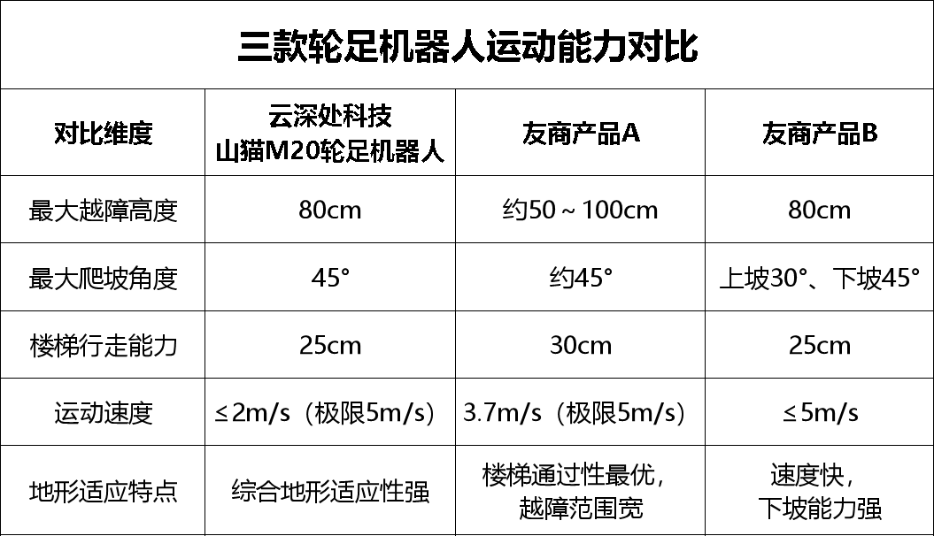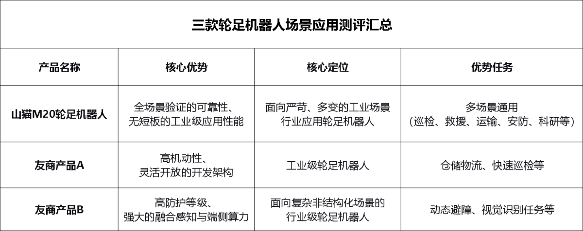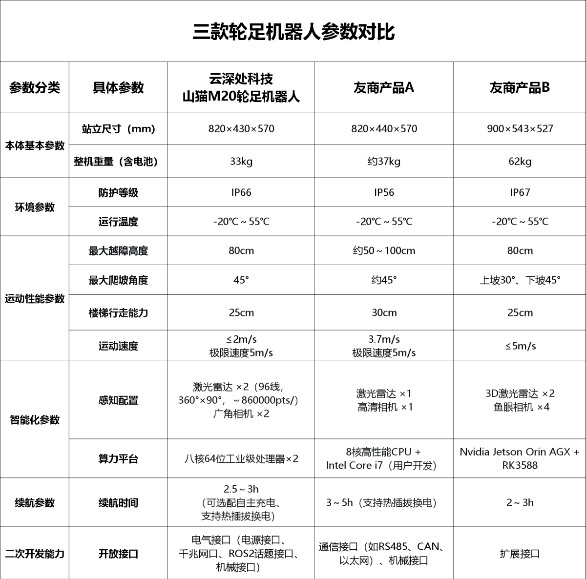 本文特选取两款与山猫M20定位一致的行业级轮足机器人产品,从本体实力(极端环境作业能力、运动能力、感知系统、任务耐力)、二次开发潜力、落地应用广度及运行稳定性四大核心维度,展开全面、深度的横向测评,全程基于产品官方参数及公开落地案例,力求呈现最真实的产品实力对比。