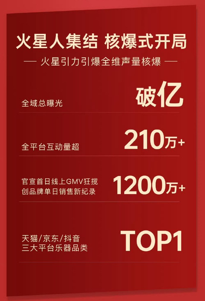 赛博吉他的市场爆发力,在与顶层IP的碰撞中得到了最直观的印证。最新战报显示,代言人华晨宇联名款“火星赛博吉他”开启预售后,全网销售额迅速破千万,稳居乐器单品销量榜首。